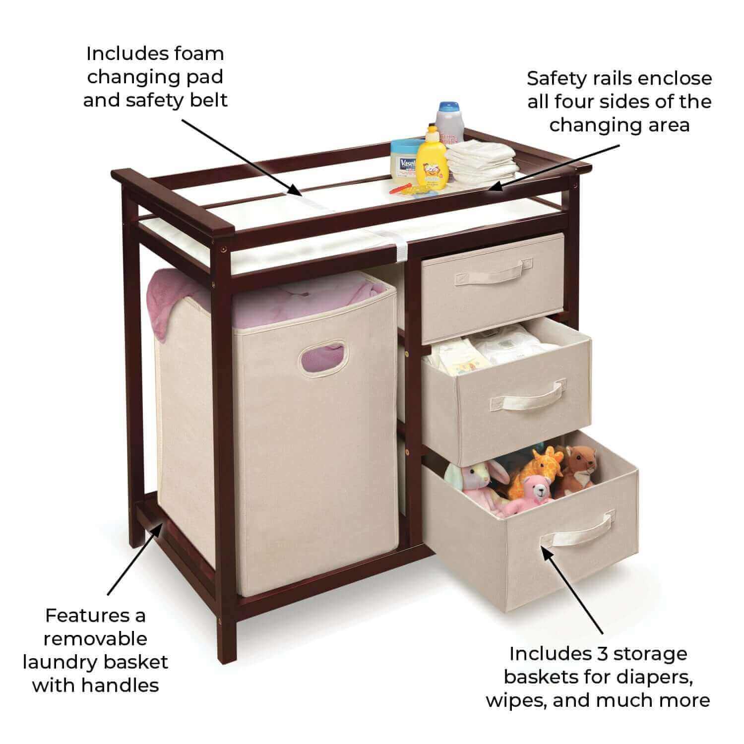 - Ample Storage: Includes a removable hamper and three spacious baskets for organizing baby essentials like diapers, wipes, and clothes.