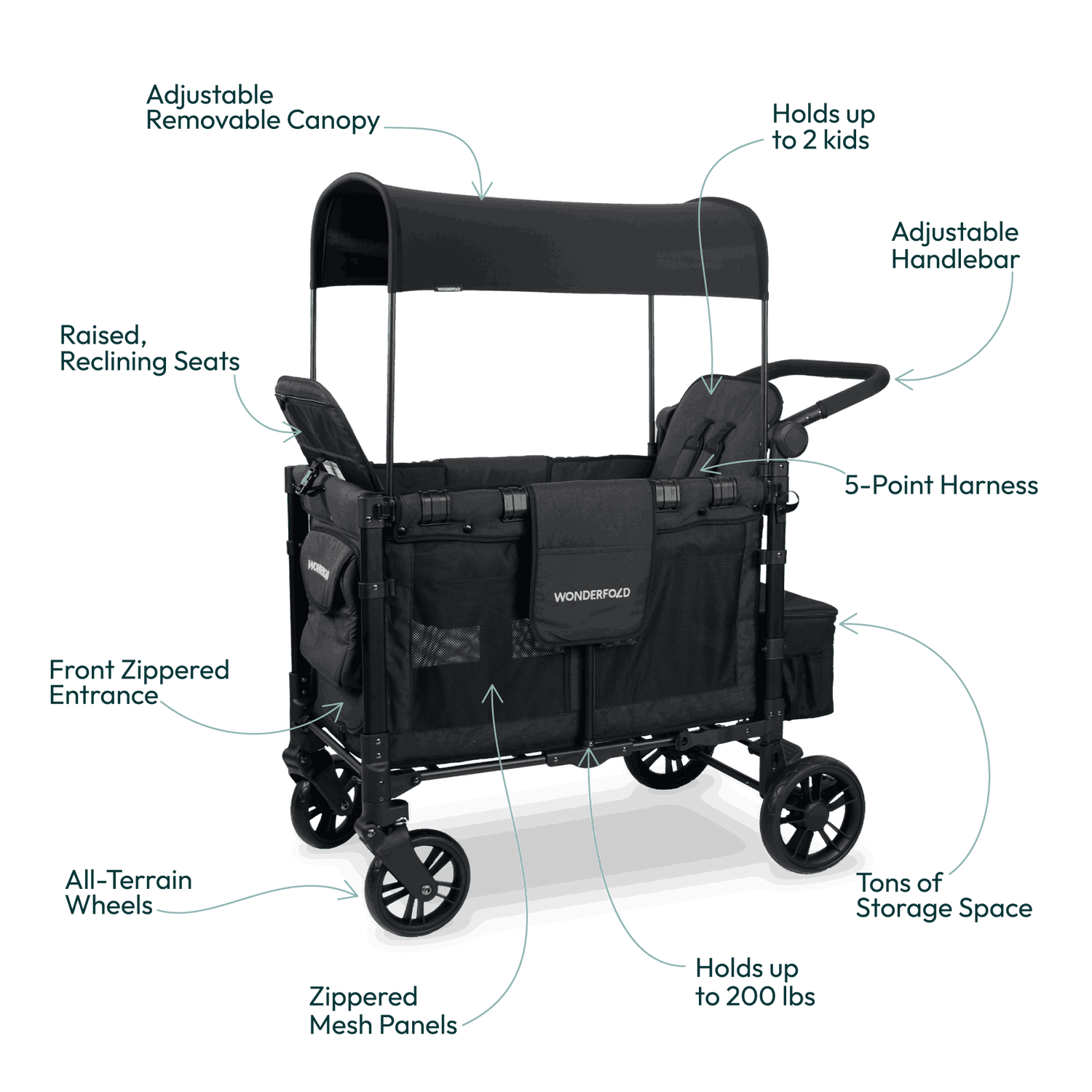 The W2 Elite Stroller Wagon combines comfort, safety, and practicality for seamless family outings. This sleek 2-seater wagon features reclining raised seats, secure 5-point harnesses, and all-terrain wheels for smooth maneuvering. With an adjustable handlebar and one-step foot brake, it’s designed to accommodate parents of all heights, making every adventure effortless.
